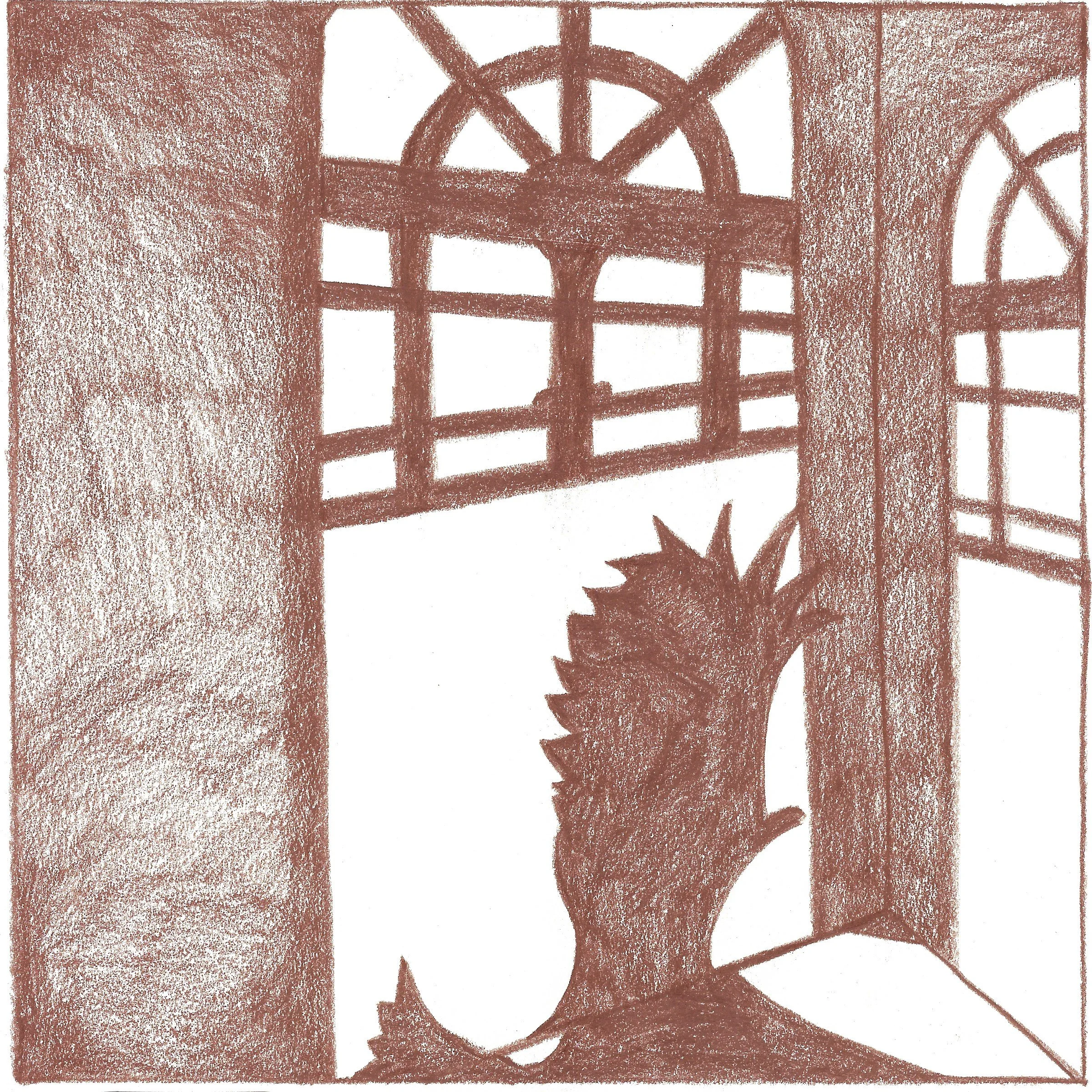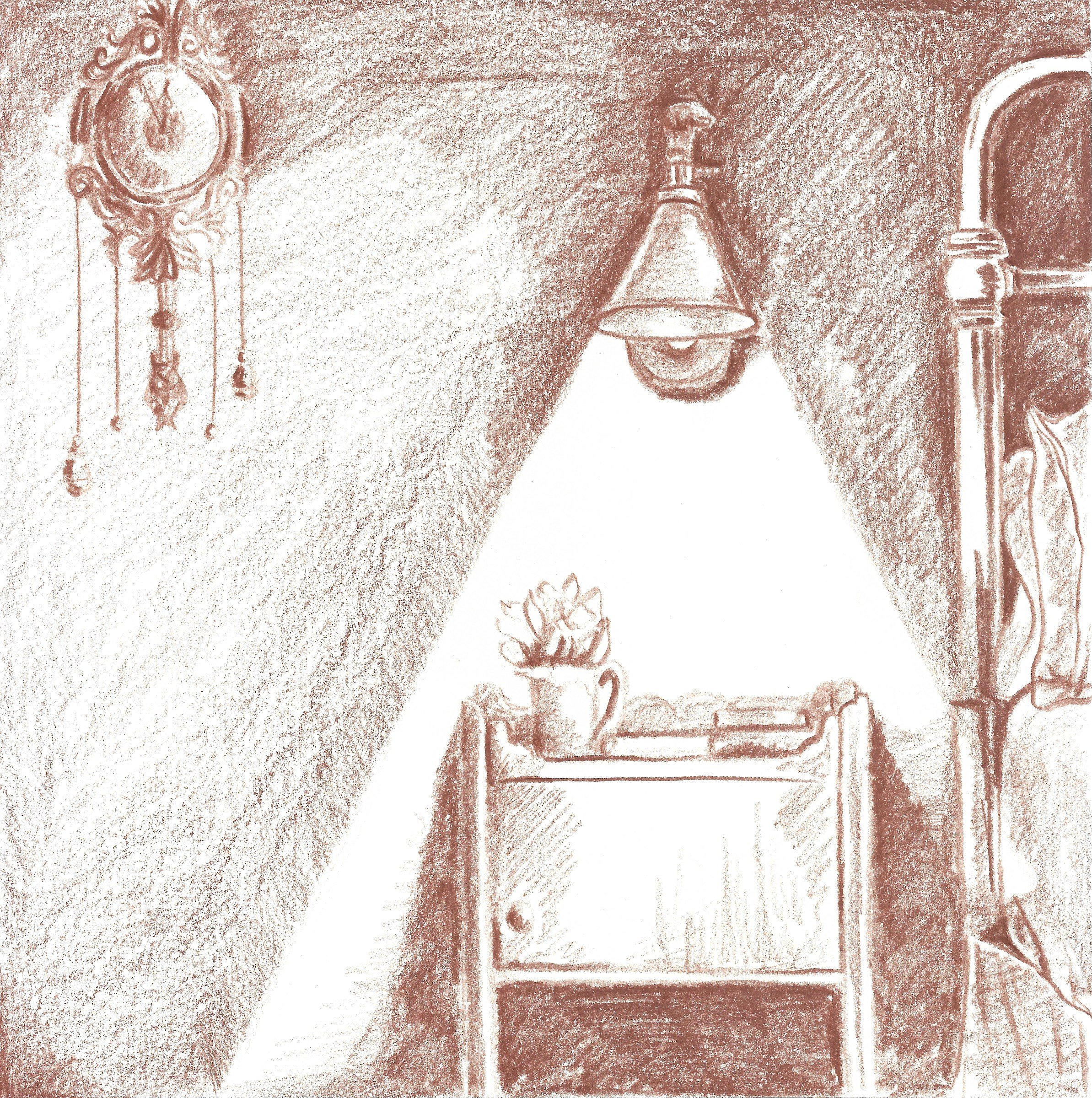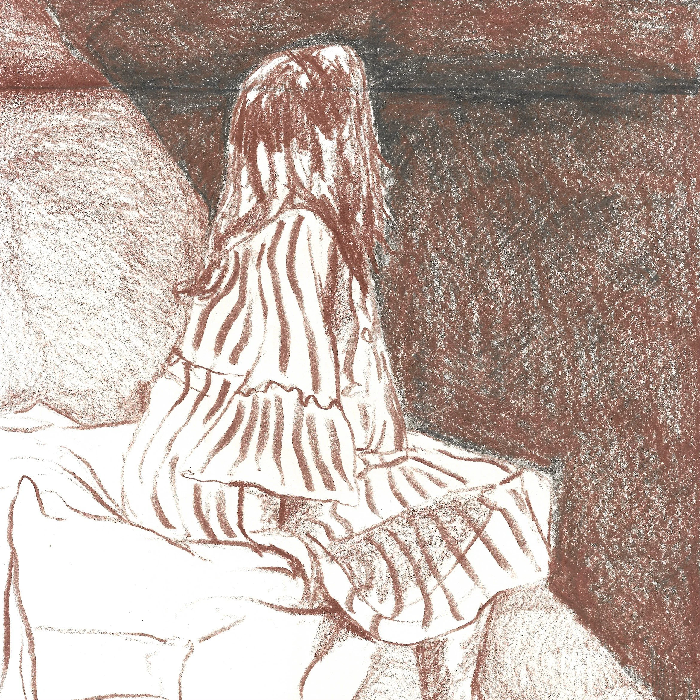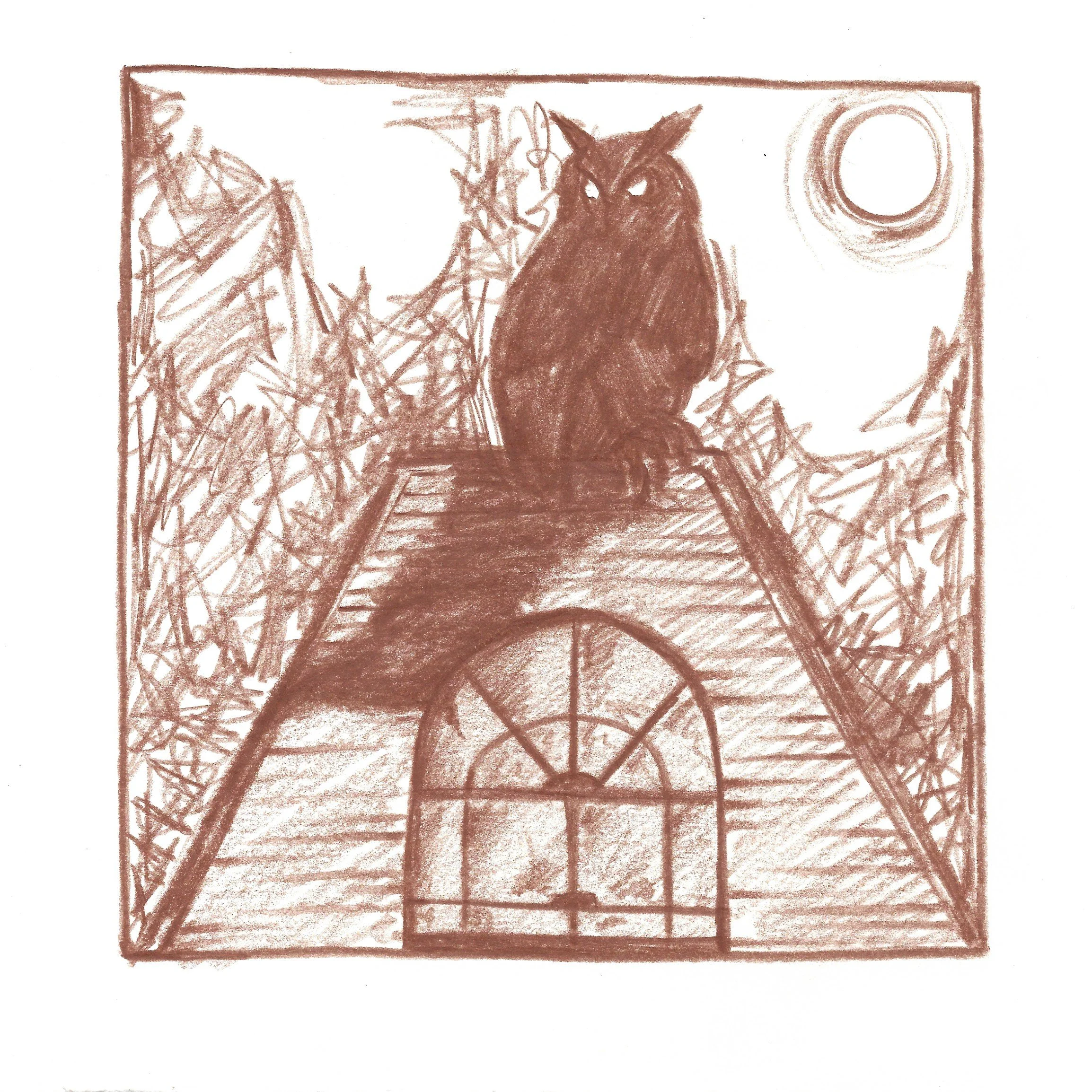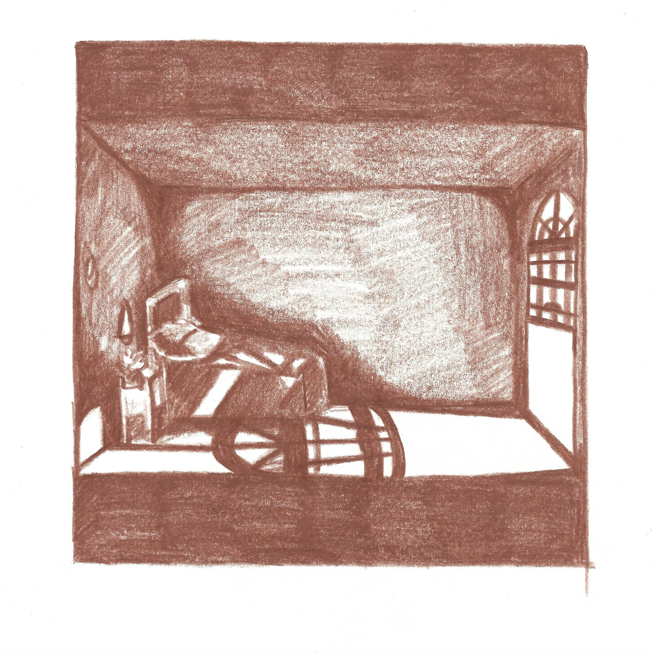 Limitations of the brief were to work in a square format, and I additionally chose to work in monochrome, using a chestnut Caran d’Ache watercolour pencil. It was an intentional decision not to include any text in the story, preferring to leave the piece open to interpretation.